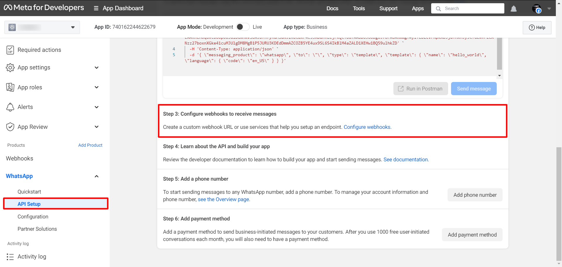 Now, you have to configure the webhook to receive messages. To configure webhooks, go to step 3 from the API setup and click on the Configure webhooks link.